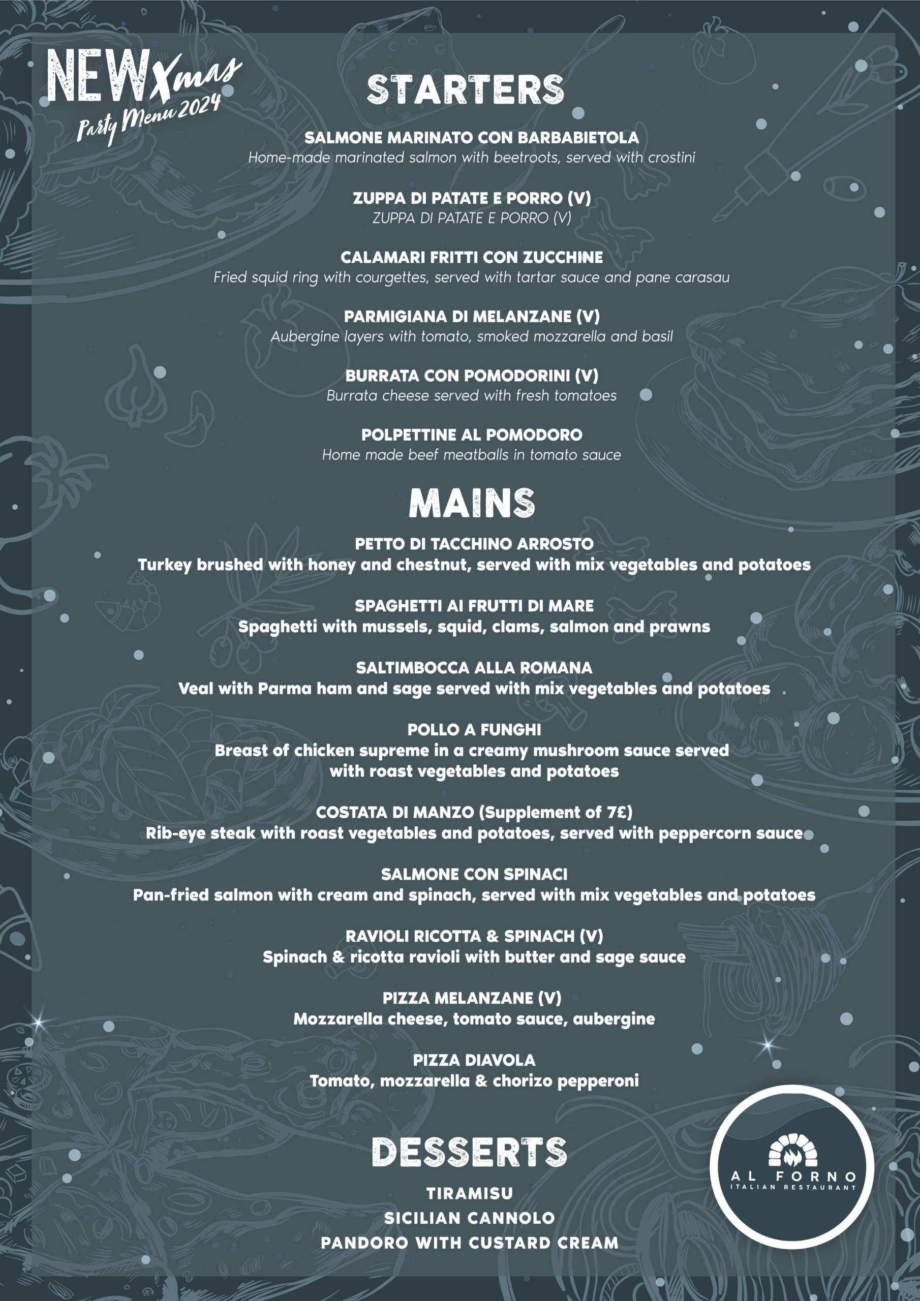 – New Year’s Eve: set menu £81 per guest. DJ set. Dance, Music & Fireworks.