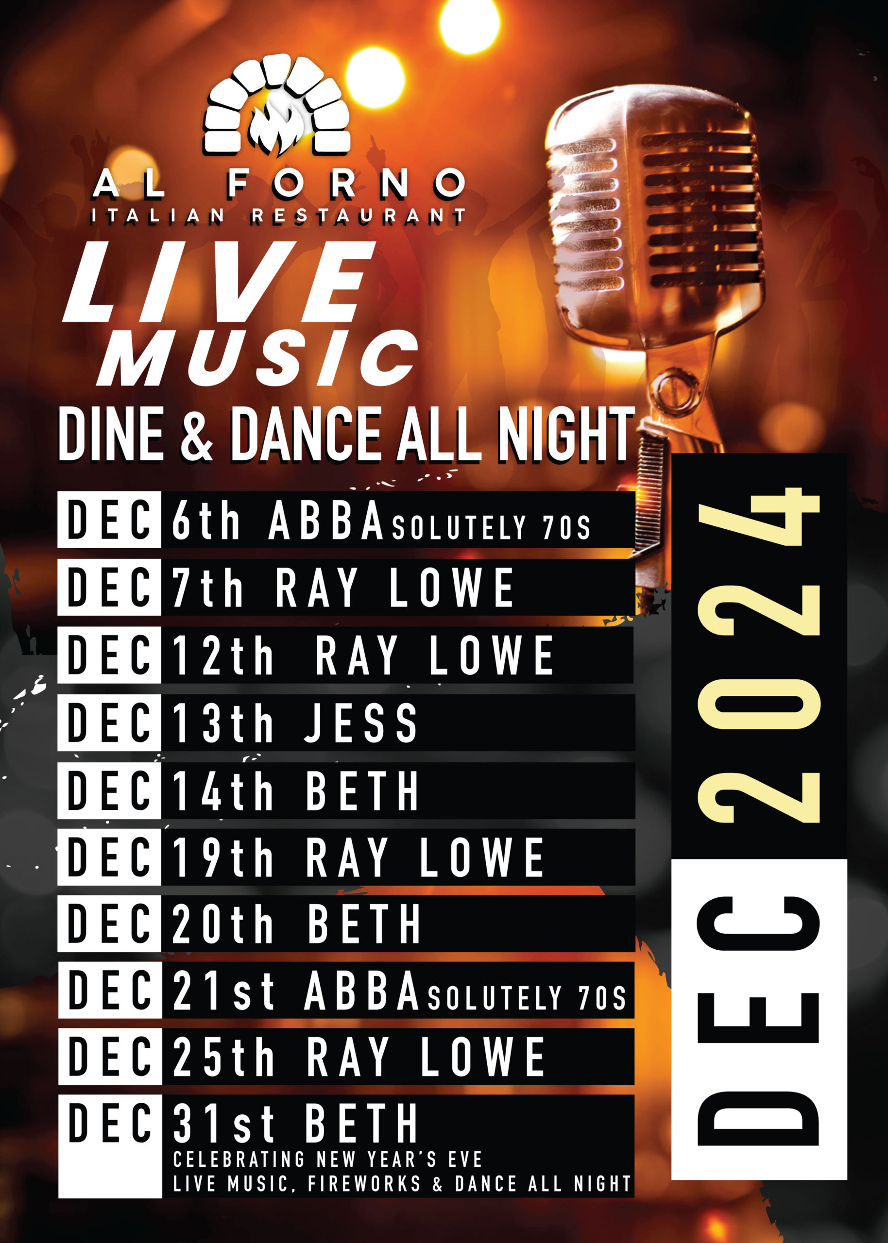Big Hair presents ABBAsolutely 70s performing classics from Abba and the seventies. Al Forno Kingston - DEC 6th & 21th 2024 - Don't miss the Groovy Night Bookings must be made in advance, this is expected to sell out fast: Call us on 020 8439 7555 or book online SET Menu Available NOW! Menu [...]